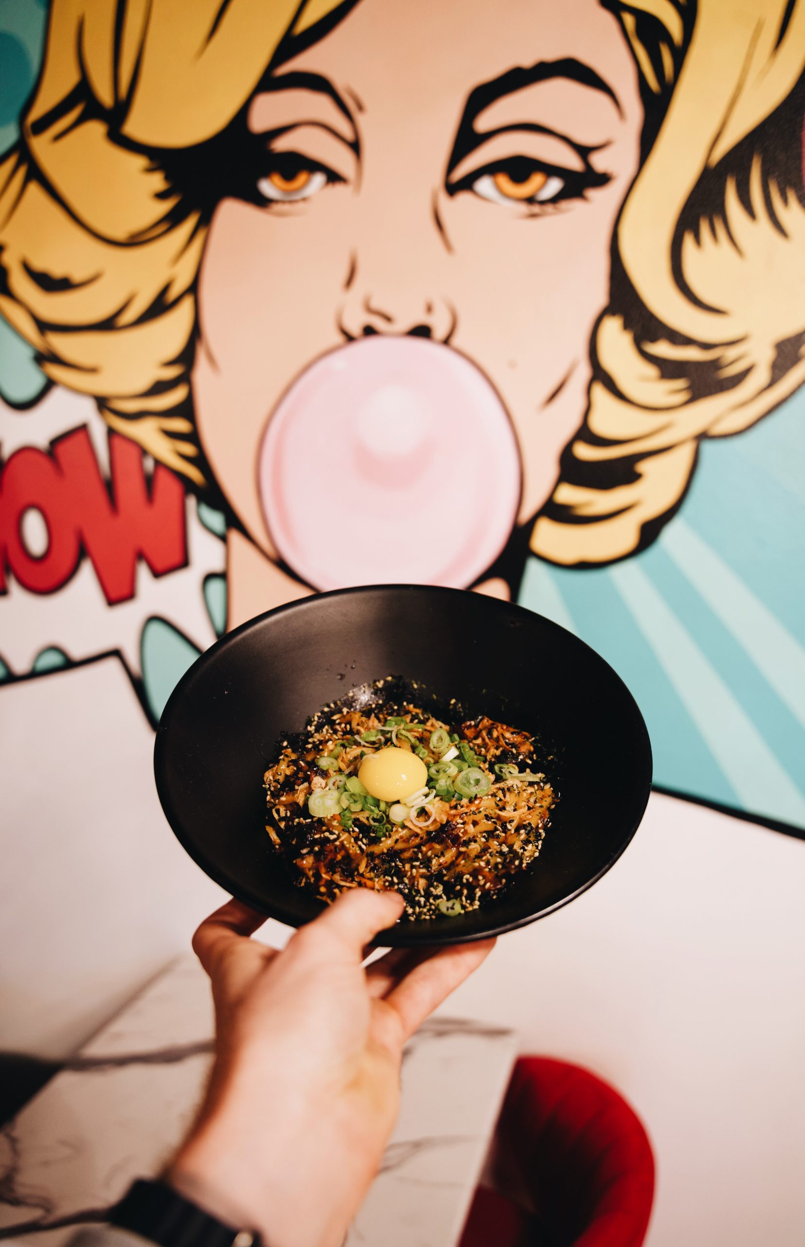 Blazing Noodles Udon Noodles + Chile crisp + shitake mushroom + Napa cabbage + shredded carrots + green onion + furikake + raw egg yolk add Shrimp or Chicken