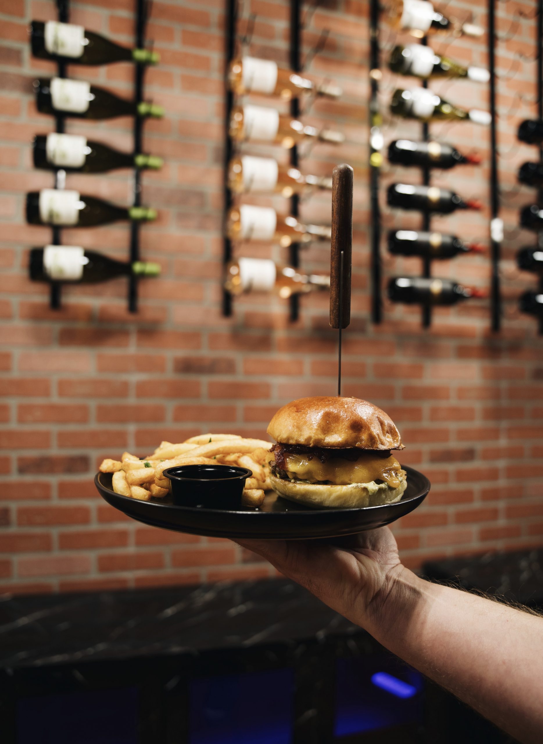 The Dip Short Rib + sharp cheddar cheese + onion jam + bacon bits + crispy onion + horseradish aioli on a brioche bun with a side of au jus served with crispy french fries